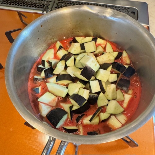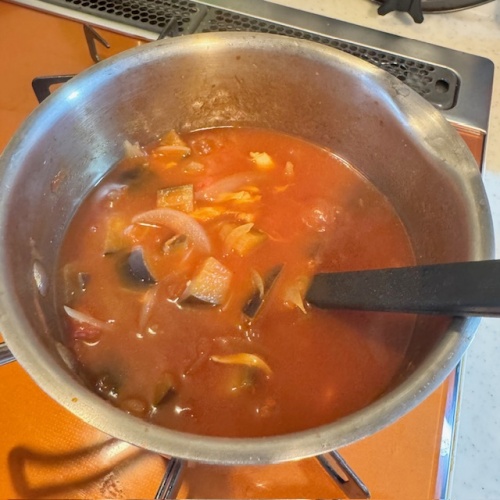 トマト缶、水、薄切りにした玉ねぎ、一口大に切ったなすび、 ほぐしたささみ、コンソメを入れ15分ほど煮ます。