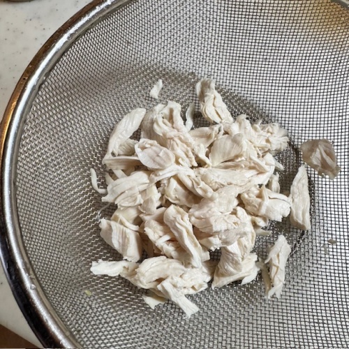 茹でたささみをザルにあげ、粗熱が取れたら手でほぐします。
