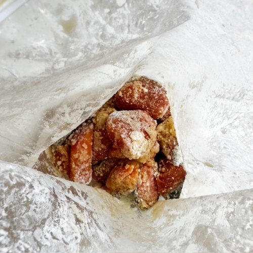 漬け込んだ汁を捨て、袋に入れて片栗粉を塗したら、 口を閉じたままシャカシャカ振って全体に片栗粉を塗します。