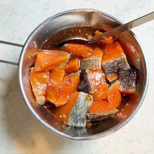 サーモンの骨を抜き、一口大に切ったら酒、醤油、みりん、 生姜、レモン汁を入れ、20分ほど漬け込みます。