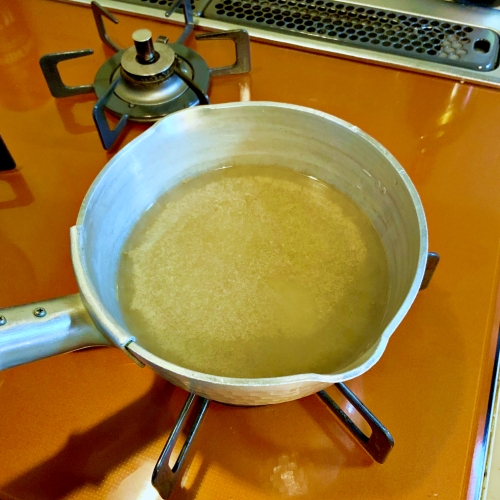 小鍋に水とほんだしを入れ沸騰させます。