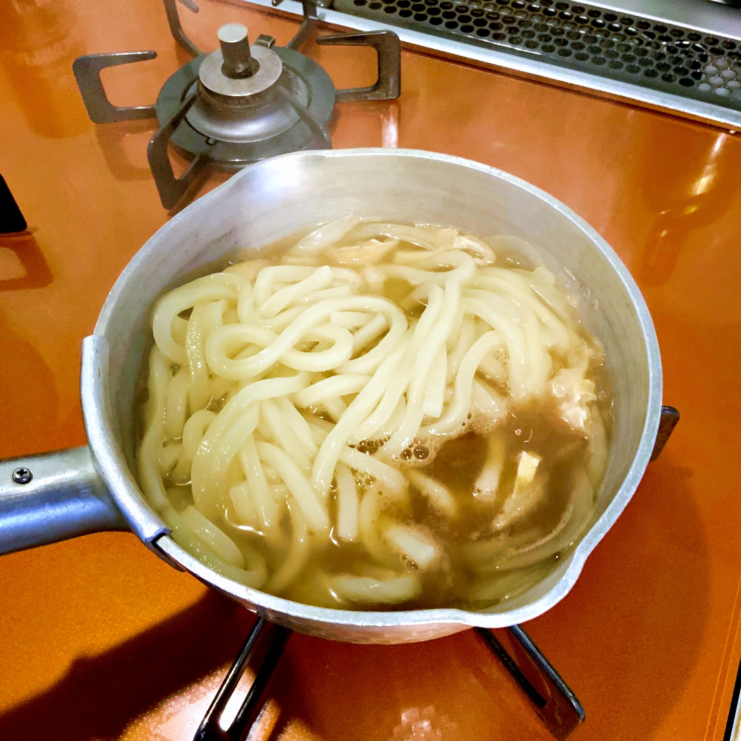 解凍したうどんとカレールゥを入れ、3分ほど煮ます。