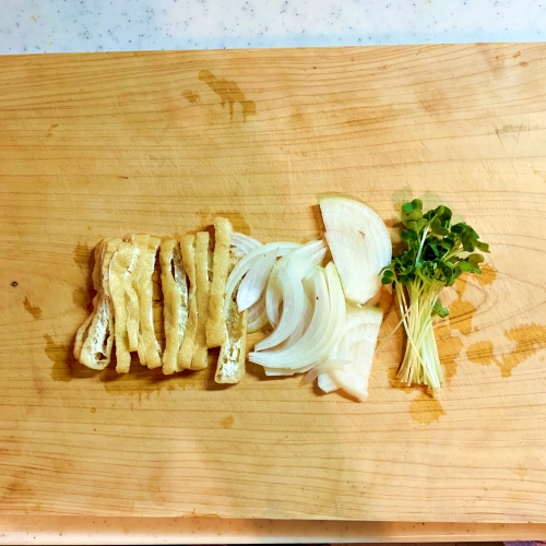 玉ねぎを薄切りに、うすあげを短冊切り、かいわれの根本を切ります。