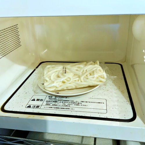 冷凍うどんを袋のままレンジ(500W)で4分温めます。