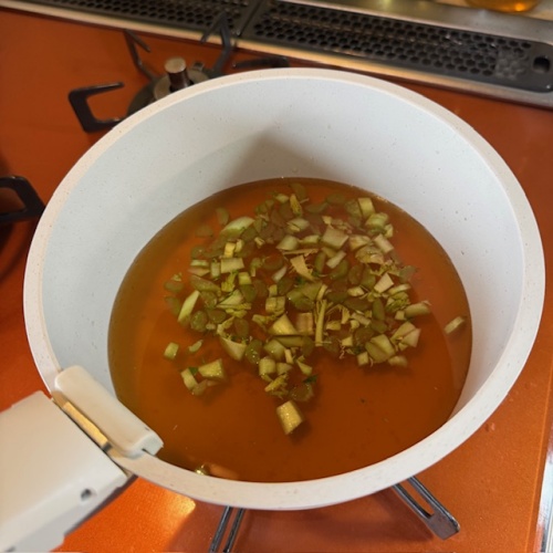 水、めんつゆ、大根の葉っぱを鍋で温めます。