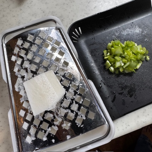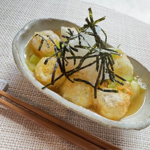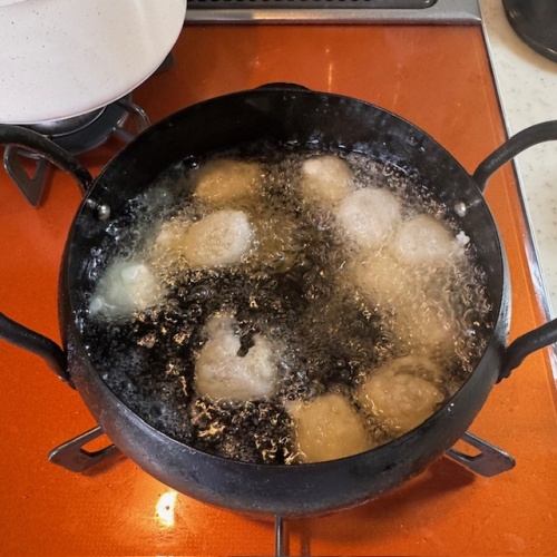分量外の油で③を揚げます(外側がカリッとなったらOK!)