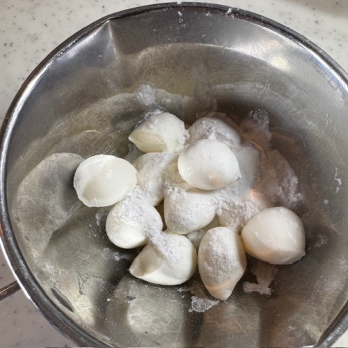モッツァレラチーズの水を切り、片栗粉をまんべんなくまぶします。