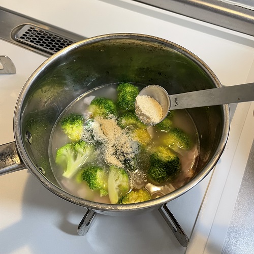 ブロッコリーを入れ全体を混ぜ合わせたら水を入れます。