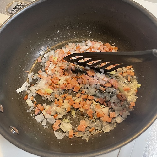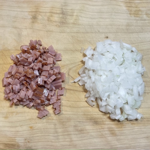 チャーシューと玉ねぎをみじん切りにします。