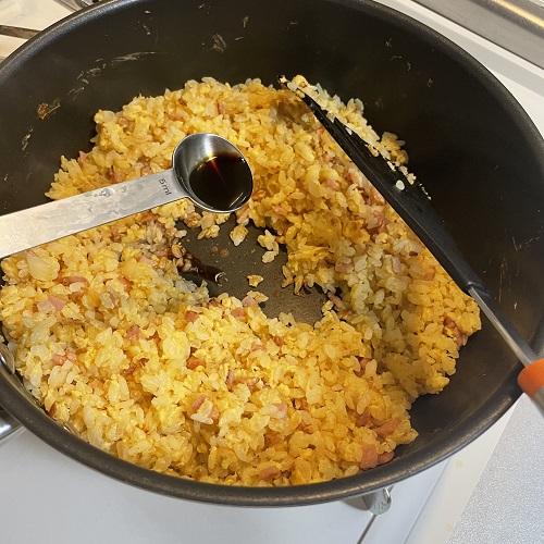 ③の玉ねぎが透き通ってきたら④を入れて炒め、お米がパラパラになったらフライパンの部分に醤油を垂らし塩こしょうを振り炒め合わせます。