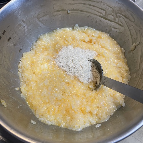 温かいごはんをボウルに入れ、卵と鶏がらスープの素を入れてよく混ぜます。