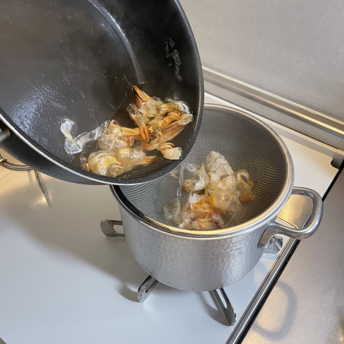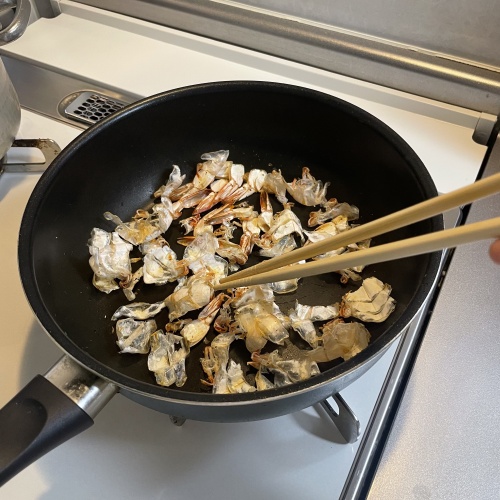 エビをよく洗い殻を剝き背わたを取ったら、殻をフライパンで乾煎りします。