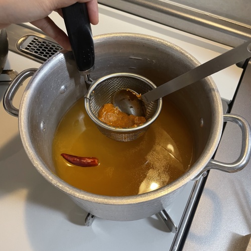 スープにトムヤムペースを味噌こしザルで溶きます。(唐辛子は種を取り除きお好みで。入れると激辛になります!)