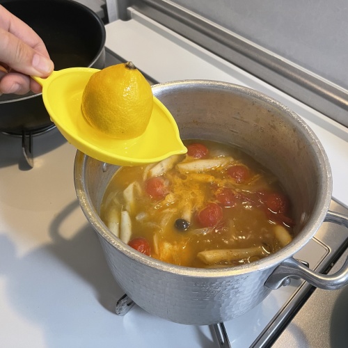 具材に火が通ったらレモン汁と砂糖、ナンプラーを入れます。