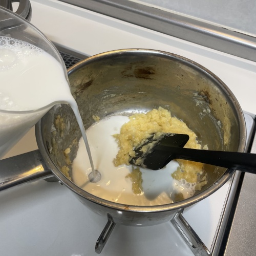 牛乳を5回程に分けて入れていきます。都度よく混ぜながらとろみがついたら次を入れる感じです。