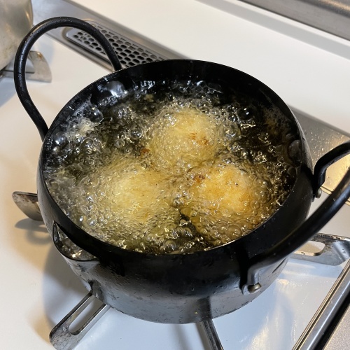 食べやすいサイズに⑤を丸めバッター液、パン粉を付けます。パン粉はまんべんなく綺麗に付けるのがコツ♪