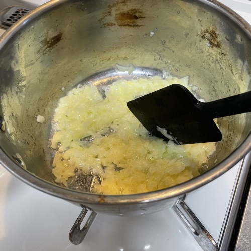 熱した鍋にバターを入れ、溶かしたらみじん切りにした玉ねぎを炒めます。
