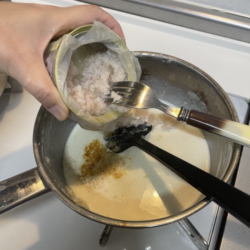 最後の牛乳を入れたらコンソメ、塩こしょう、カニ缶を入れもったりするまでよく混ぜながら火を入れます。