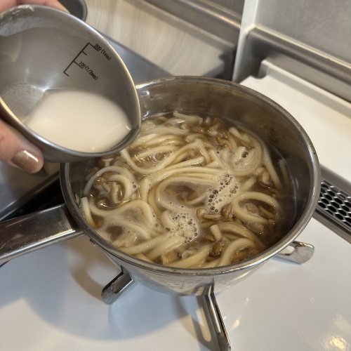 3分程経ったら火を止め水で溶いた片栗粉を入れ再び火をつけます。