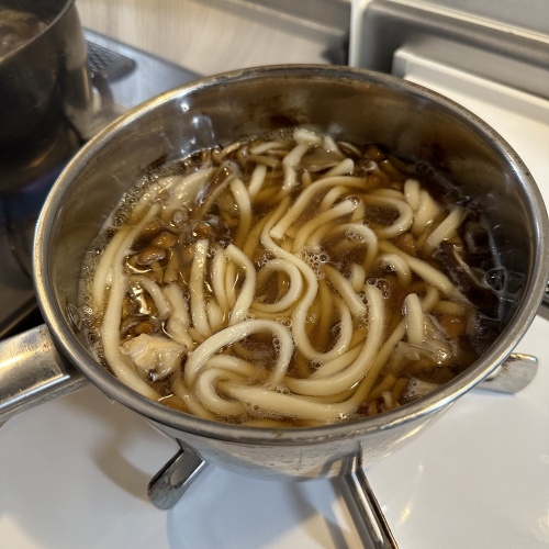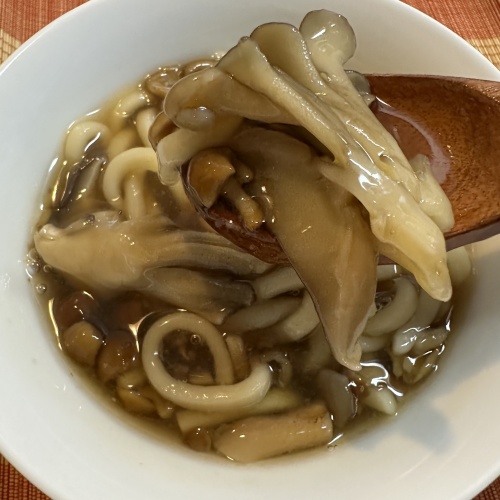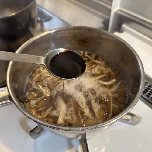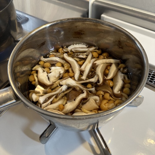 鍋にスープと一口大に切ったきのこ、洗ったなめこを入れ煮立たせます。