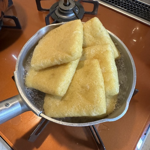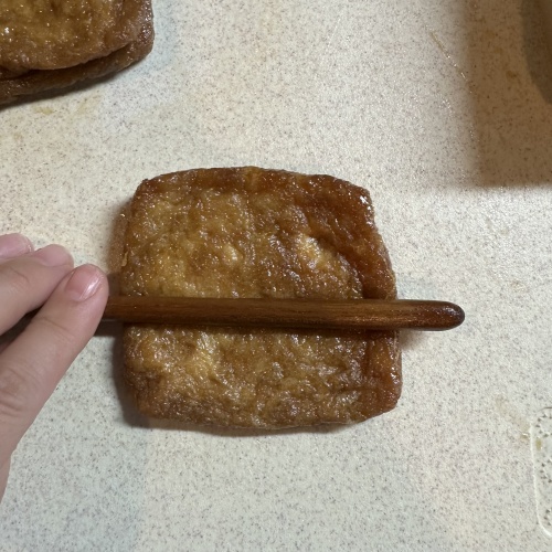 鍋にお湯を沸かし、すしあげを入れて油抜きしたらザルにあげお湯を切ります。