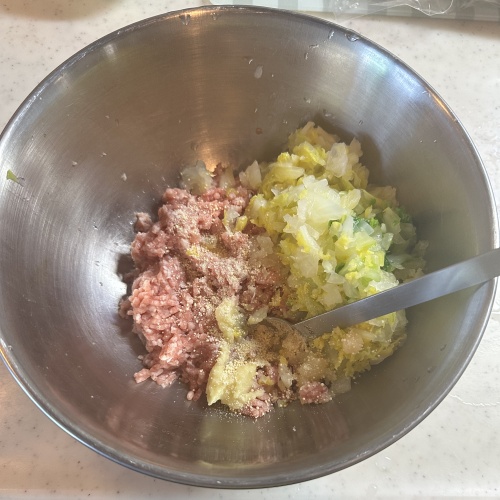 ②に③を入れ、しょうが、にんにく、鶏がらスープの素を入れてよく混ぜます。