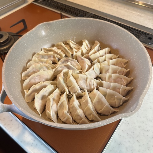 フライパンにごま油を入れ、⑤を並べてから火をつけ中火で焼き目が付くまで焼きます。