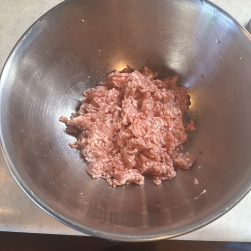 常温に戻した豚ひき肉に塩を入れ混ぜます。