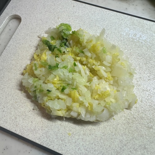 ①の白菜をザルにあげ、流水で粗熱を取ったらみじん切りにして水気を絞ります。