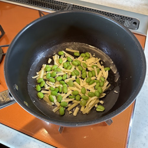 フライパン(くっつくようであれば少し油を引いてね)に水にさっと潜らせたライスペーパー、枝豆、チーズを乗せ中火にかけます。