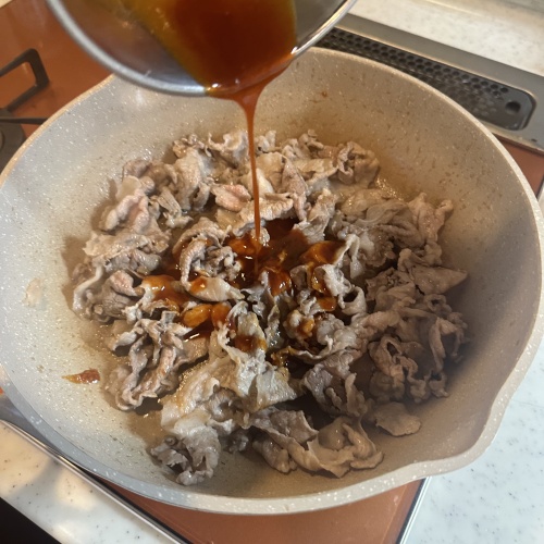 豚肉に火が通ったら②を入れ、炒め合わせます。