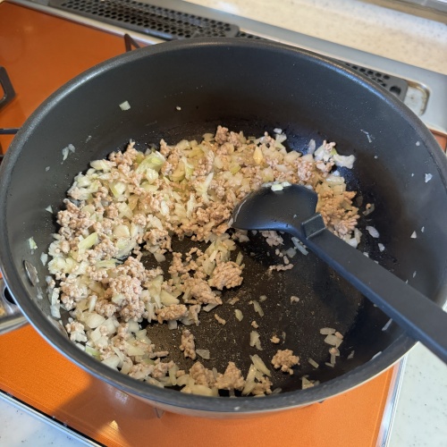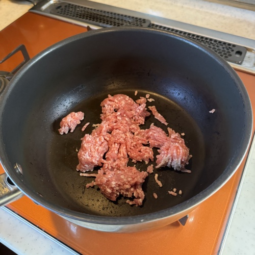 フライパンを熱し、油を引かずに豚ひき肉を炒めます。