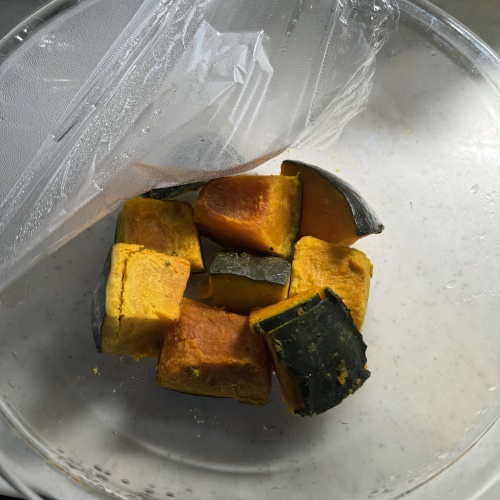 冷凍かぼちゃを耐熱容器に入れ、水を少しかけてラップをしたらレンジ(600w)で8分温めます。(購入した冷凍かぼちゃに表示してある解凍方法で解凍してね♪)