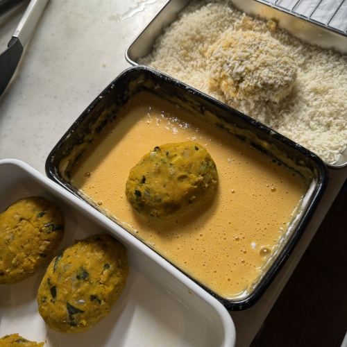 溶いた卵に小麦粉を入れ、よく混ぜたバッター液につけてパン粉をまぶします。