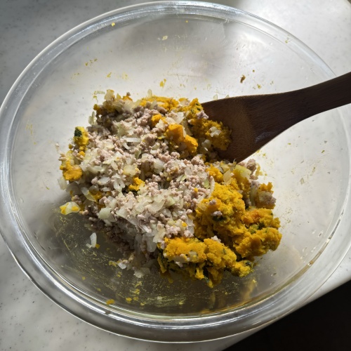 解凍したかぼちゃをヘラで潰したら②を入れ、砂糖と塩こしょうを入れ混ぜます。