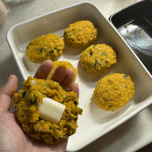 小判形に形を作ったら、さけるチーズを真ん中に入れて丸めます。