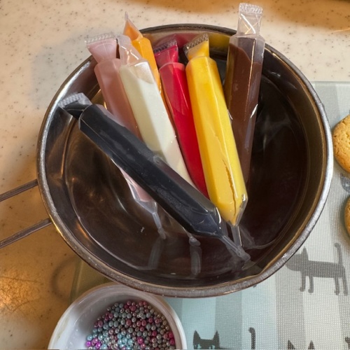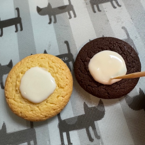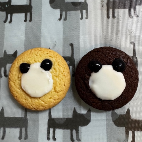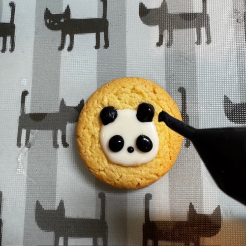 チョコペンが溶けたら、白のチョコペンの先を斜めにカットして、クッキーに丸を描きます。
