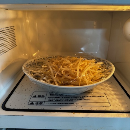 お皿にもやしを入れ、ラップをしてレンジ(600W)で3分温めます。