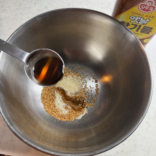 ボウルにごま、ごま油、とりがらスープの素、白だしを入れて混ぜておきます。