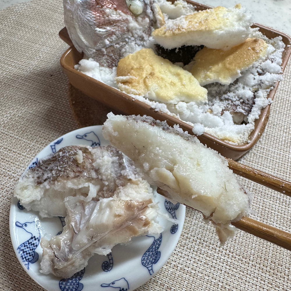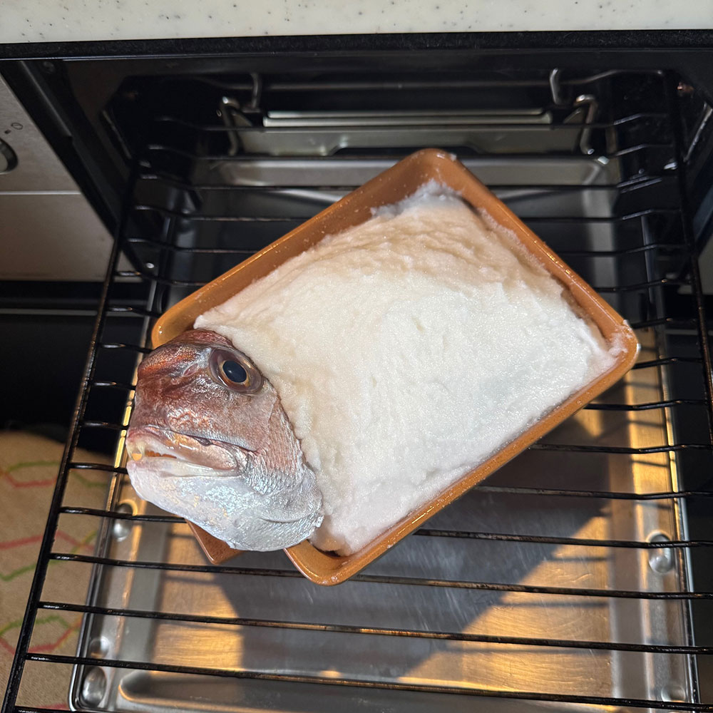 塩と卵白をよく混ぜ合わせて、お魚を隙間なくすっぽりと覆うのが、身をふっくらジューシーに仕上げる最大のコツです。塩のドームがオーブンの役割を果たし、昆布の旨みと鯛の水分を逃さずギュッと閉じ込めてくれます。もし表面の塩が焦げすぎる場合は、途中でアルミホイルをフワッと被せると綺麗に仕上がりますよ。